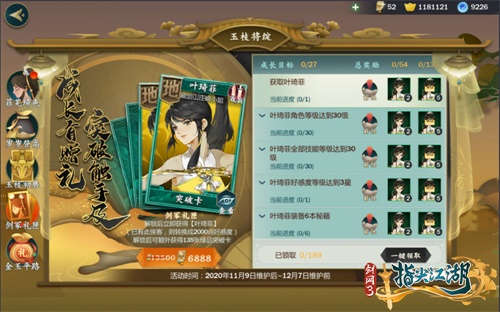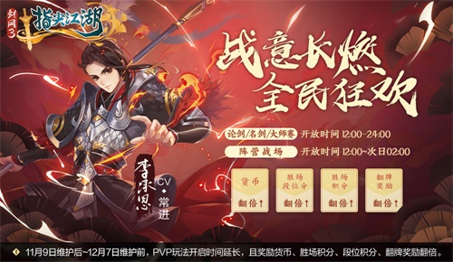 由西山居倾力制作,腾讯游戏独家代理的二次元武侠多角色手游《剑网3:指尖江湖》全新版本“虎啸龙吟”火爆进行中! 盛松归落金雏燕,稚喙犹衔柳叶青。全新侠客【叶琦菲】携诸多好礼闪亮登场!与此同时,11.11全民狂欢盛典火爆开启,全新【超武、外装】、【海量通宝】掉落、【予君所寻】卡池(随心寻访)、限时【福币兑换】等福利钜惠来袭!赶快看看如何将它们抱回家吧!开冲! 【叶琦菲驾到 新侠客赠礼】 1. 玉枝初展 新侠助威 商行有明主,碧玉正当时。全新侠客叶琦菲初入江湖,携带【玉枝令】助力少侠极致养成。当少侠激活侠客叶琦菲后,即可免费领取【玉枝令】。领取后侠客获取经验、上缴好感度道具获得好感度均提升,升级技能消耗修为减少。 活动期间,使用侠客【叶琦菲】参与【秘境】【光明寺】【神剑谷】【论剑】【名剑】【大师赛】【阵营战场】均可获得buff力量加持! ·使用侠客出战【秘境】时,侠客以及队友伤害、血量均有所提高; ·使用侠客成功参与【光明寺·挑战】每个秘境宝箱大概率额外掉落【六阶套装】;成功参与挑战【光明寺·宗师】,每个秘境宝箱必定额外掉落【六阶套装】。 ·使用侠客成功挑战【神剑谷·二层】【神剑谷·三层】每个秘境宝箱必定额外掉落【六阶套装】。 在此提示众少侠:上述活动同等效果不叠加,需8人队伍才可生效哦! 此外,少侠使用侠客叶琦菲出战【论剑】【名剑】【大师赛】获胜,获得的【论剑币】【名剑币】【大师币】以及【竞技点数】额外大幅提升,队伍内所有成员2200分以下失败不掉分!同样使用侠客出战【阵营战场】并获胜,少侠获得的威望值也提升,同时额外获得【阵营物资】。 2. 金玉平路 助力养成 为助力少侠快速养成新侠客,更有【金玉平路】特惠经验包、修为包、五行石、全套秘籍特惠礼包上线,助力少侠与叶琦菲闯荡江湖。 3. 剑冢礼匣 成长赠礼 成长有赠礼,突破触手及。藏剑女侠叶琦菲重磅登场,剑冢礼匣赠少侠!活动期间,少侠与【叶琦菲】达成指定成长目标,即可领取相应的赠礼!若少侠希望与菲菲共同获取剑冢礼匣更多豪礼,可购置进阶版奖励。 少侠与菲菲每完成1个目标,即可领取叶琦菲【突破卡·绿】,若少侠购买了进阶版奖励,可额外多领取【叶琦菲】绿色品质突破卡·。当少侠购买进阶版奖励,可立刻激活侠客【叶琦菲】,若少侠已获得该侠客,则转化为一定数量的叶琦菲【好感度】。 【泠泉锦鲤 尽显真色】 清泉星影澈,指尖锦鲤旋。传闻中一位来自神秘苗疆的小女孩,可使水中鱼儿身覆艳色,自此江湖流传着“千年流月泉清冽,一梦星影醉锦色”的浪漫说法,少侠使用【醉秋星砂】即可让池中锦鲤尽显真色。 活动期间,少侠通过【战场】【江湖论剑】【大师赛】【名剑大会】【弈星迷阵】【云梦幽墟】【四人秘境】【八人秘境】等玩法可免费获取【醉秋星砂】,消耗【醉秋星砂】可激活池中锦鲤,使锦鲤显色,当池中九条锦鲤皆被激活显示真色,少侠即可祈福开启奖池【观鱼赠礼】或【锦鲤豪礼】,从奖池中随机获得一份奖励,每天最多可开启3次奖池。少侠可在两个奖池中获得缤纷好礼! 除了自力更生激活锦鲤之余,少侠亦可在【世界频道】【帮会频道】【好友频道】【师徒频道】发送锦鲤着色助力请求,其他少侠对于每个助力请求均可助力一次,助力成功的少侠会消耗1个【醉秋星砂】但获得一定的助力值,当助力值全满,奖池则由【观鱼赠礼】升级为【锦鲤豪礼】哦! 此外,江湖为助长乐于助人的风气,如果少侠获得奖池中的【通宝】奖励,那么参与助力的少侠也可获得相应数量的【通宝奖励】。 【旗鼓好礼 珠玉摇光】 活动期间,少侠通过购买【机缘礼包】获得消耗型趣味道具【冬寒遗冰】,且附赠少侠不同数量的活动货币【龙虎契】。与此同时,少侠参与【名剑大会】【江湖论剑】【阵营战场】【大师赛】【泠泉锦鲤】【累计签到】也可获不同数量【龙虎契】奖励!少侠消耗【龙虎契】即可前往参与【旗鼓】游戏! 少侠可从三个奖池中各选一份奖励进入自己的许愿清单,选择完毕后方可开启抽奖。 第一奖池:背部可交互挂件【渊崽崽】、背部可交互挂件【遗崽崽】; 第二奖池:谢渊外装【凭栏】、王遗风外装【池平】; 第三奖池:谢渊武器外观【备胄王侯】、王遗风武器外观【红尘酣烛】。 少侠的许愿清单里的三份自选奖励都将独立累计【机缘值】,少侠每次进行抽奖时,三份自选奖励均可获得随机数量的【机缘值】,【机缘值】越高,获得许愿大奖的机会就越大。当某个自选奖励的【机缘值】满时,将必获得该选定的许愿大奖,同时清空该自选奖励的【机缘值】,其他自选奖励的【机缘值】不受影响。 此外,除却少侠们期待已久的外装挂件外,还有【七级五行石】、【赤玉·绕梦思】、【门派寻访券】、【群侠寻访券】、【洗炼·橙魄】系列、【镇岳剑帖碎片】、【绝品纳元丹】、【绝品玄九丸】、【天外陨铁】、【化玉玄晶碎片】、【洗炼石】、【金条】、【金元宝】系列等好礼! 【予君所寻 随心突破】 卡池遂君意,突破信手来。传闻中【拜友金契】为江湖中最为诚心的拜友帖,【拜友金契】在手,广交天下好友。若获此珍宝,更是易使金坚友情一日千里。 活动期间,少侠可通过完成【悬赏】【无尽试炼】【泠泉锦鲤】等玩法获得道具【拜友金契】,使用【拜
