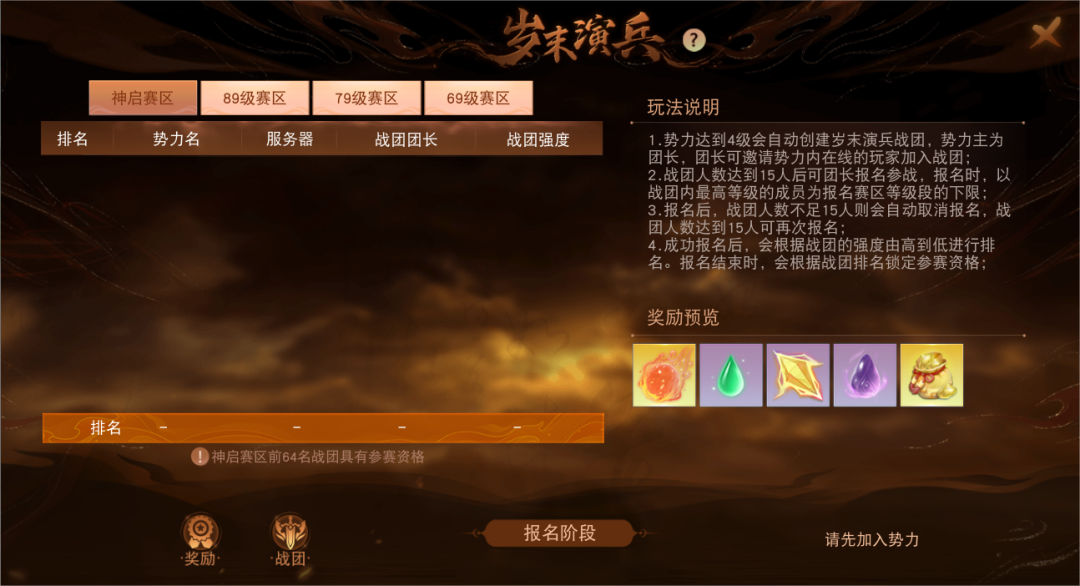 报名阶段结束时将会选出参赛的岁末演兵战团,获得参赛资格的战团将展开激烈对决!