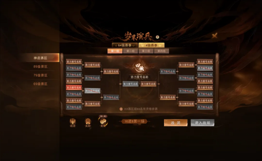 本年度岁末演兵玩法将在天下一统与新生大荒、天下贰三个大区分别进行。区内又将分为神启赛区、89级赛区、79级赛区(天下一统大区独有)和69级赛区开展对决比拼!