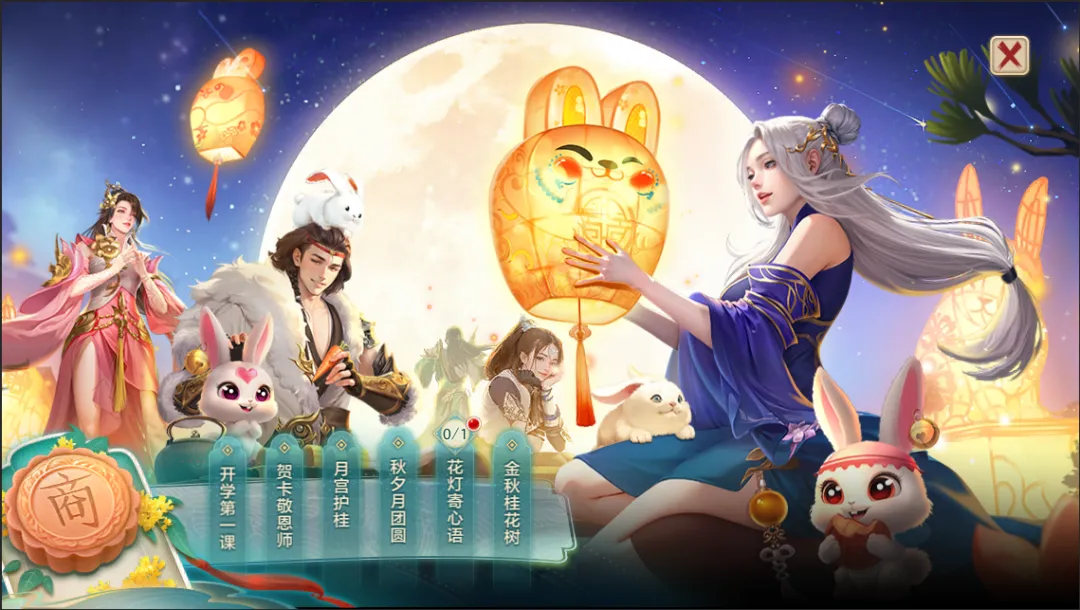 月明秋晓商店于9月1日-9月30日期间开放,此次活动代币更新为玉兔彩灯,在此期间,少侠们完成九月内的任意主题月活动、在元宝商城或绑元商城购买都可获得玉兔彩灯。