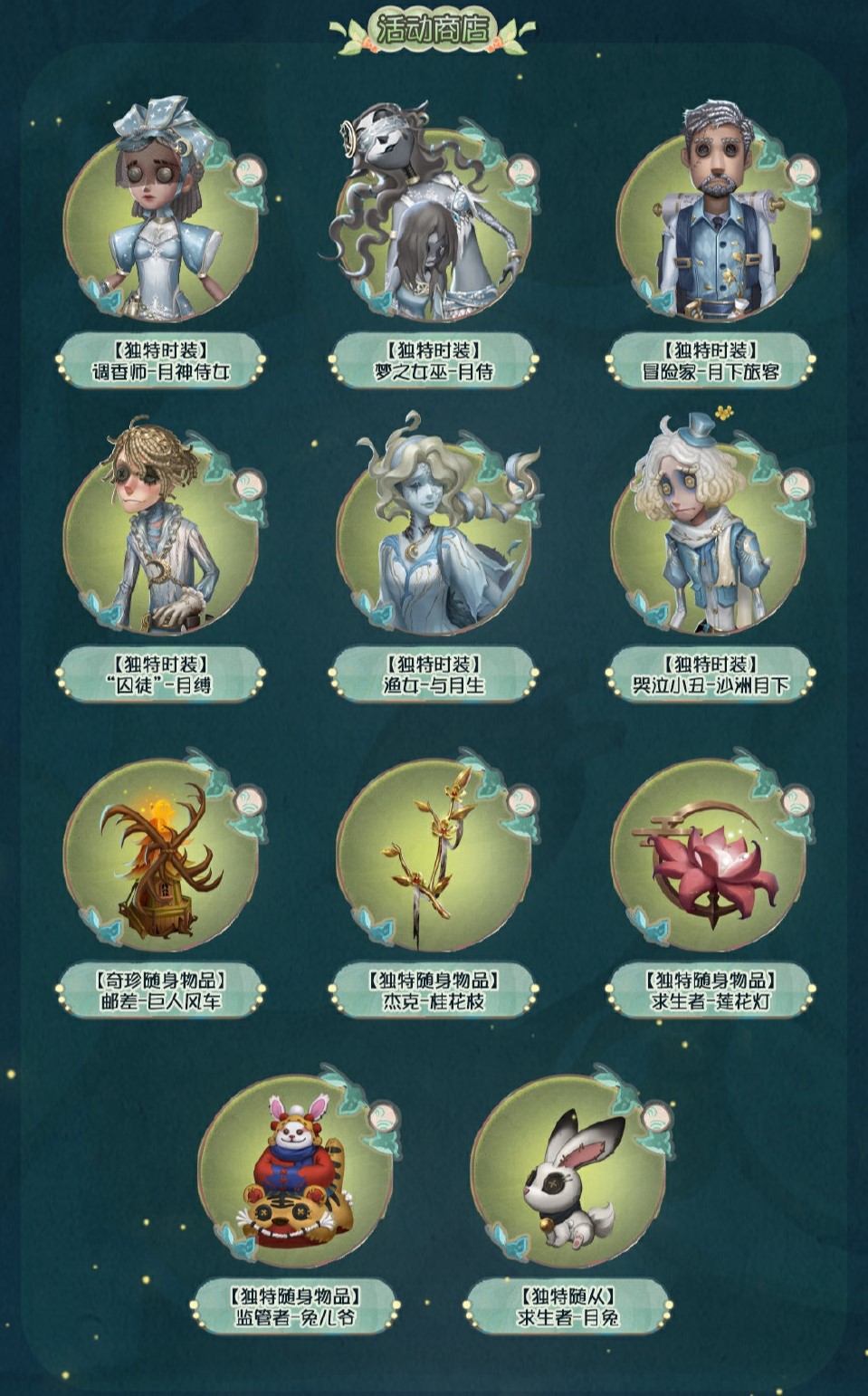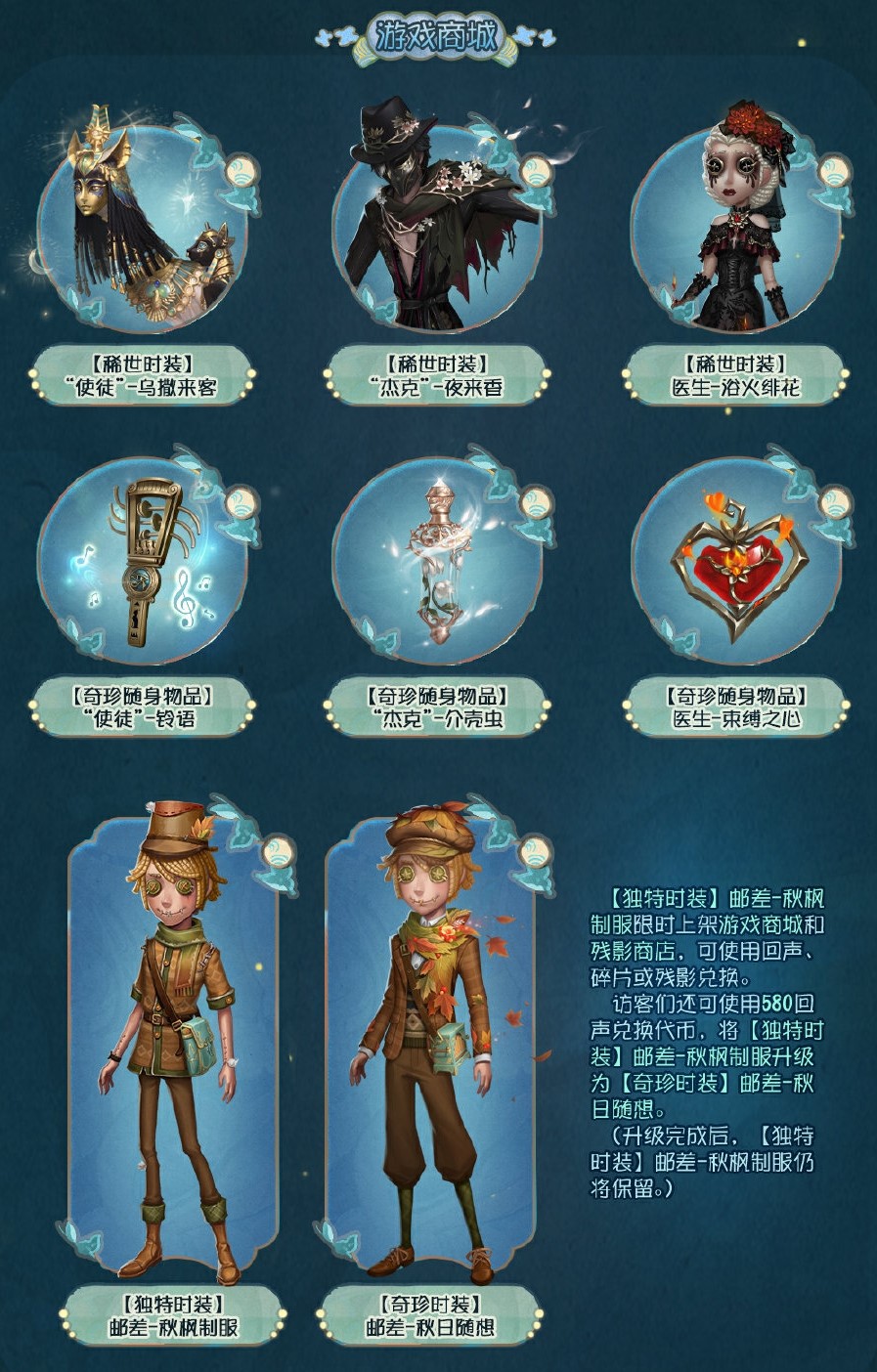 除了六款中秋主题独特时装外,【稀世时装】“使徒”-乌撒来客与【奇珍随身物品】“使徒”-铃语、【稀世时装】“杰克”-夜来香与【奇珍随身物品】“杰克”-介壳虫、【稀世时装】医生-浴火绯花与【奇珍随身物品】医生-束缚之心也将在本次活动中限时返场。值得一提的是,【独特时装】邮差-秋枫制服也将限时上架游戏商城和残影商店,访客们可使用回声、碎片或残影兑换,还可使用580回声兑换代币,将【独特时装】邮差-秋枫制服升级为【奇珍服装】邮差-秋日随想,在升级完成后,【独特时装】邮差-秋枫制服仍将保留。