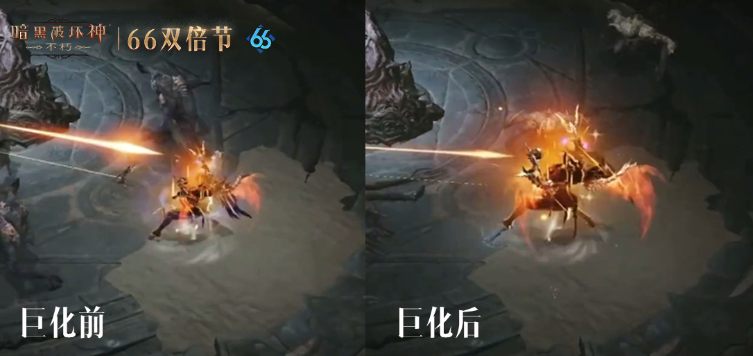 人气BUFF回归,战斗体验再升级!作为《暗黑破坏神:不朽》中最具代表性的节日,每个月的66双倍节都会收获无数玩家的期待与好评。后续双倍节中,若玩家未能及时在六星熔炉处领取奖励,可通过游戏内邮件补领,再也不用担心错过!未来《暗黑破坏神:不朽》还会基于玩家意见反馈,持续进行优化迭代,敬请期待。此外,本次双倍节中,高人气彩蛋玩法【连击巨化】也已限时回归,让每一位玩家都能获得爆爽战斗体验!9月6日3:00至9月7日2:59,双倍节活动期间,玩家在野外、副本、不朽秘境等场景中击败怪物,就有机会获得【连击巨化】BUFF,享受强力加持,越打越大,越战越勇!当玩家获得BUFF【连击巨化】时,即可通过连击来增加自己的体型和伤害,让自身在战斗中化身巨人,以高额的伤害和巨大的身躯统治全场,感受弹指间将敌人击溃的强大力量。