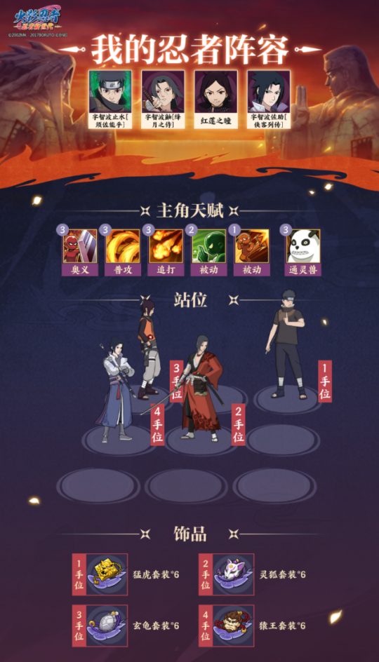 1、依靠宇智波止水[须佐能乎]的追打进行输出,依靠奥义进行打断或减少其他忍者的奥义冷却回合数;