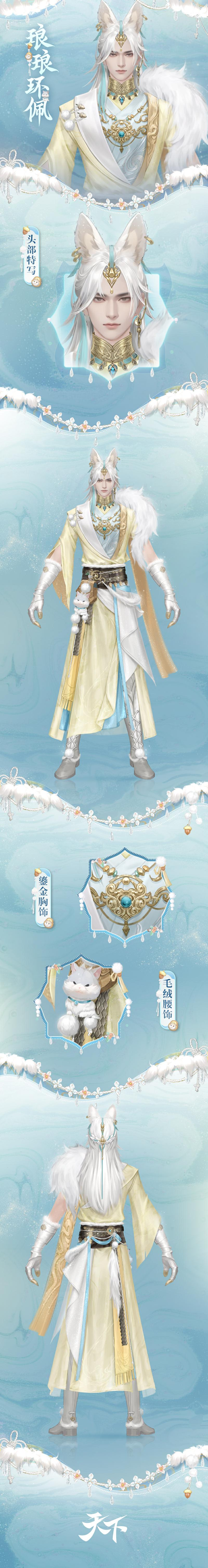 华服以淡蓝、鹅黄二色为主,其上暗纹飘渺如云,隐约可见,左肩处毛领披肩状若兽尾,胸前缀有镂空雕花金饰,中心处一抹海蓝宝石流光闪耀,举手投足间尽显华贵不凡!玄黑编织腰封丝绦毛裘轻绕,下方几颗坚果挂坠精致小巧,腰侧悬挂的褐色皮包与仓鼠玩偶,展现翩翩风姿之余又增添了几分萌趣~