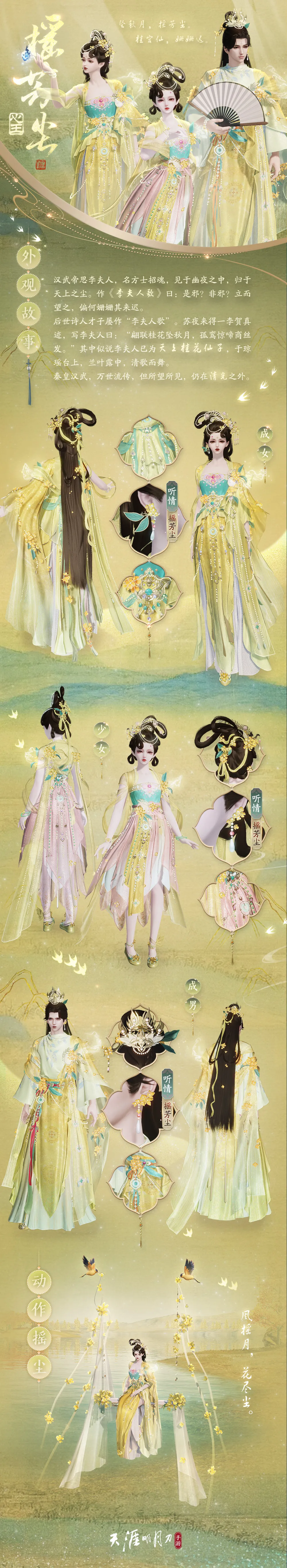 以“桂花仙子”为创作灵感,桂花元素与珠串设计呈现出一种繁复之美。在布料2.0的加持下,走路时长裙动态丝滑如流云,更显袅袅婷婷。头发运用了动态发丝骨骼技术,微风拂过,似瀑布般柔美飘逸。新增多色珍珠优化,让少侠美的更细节!
