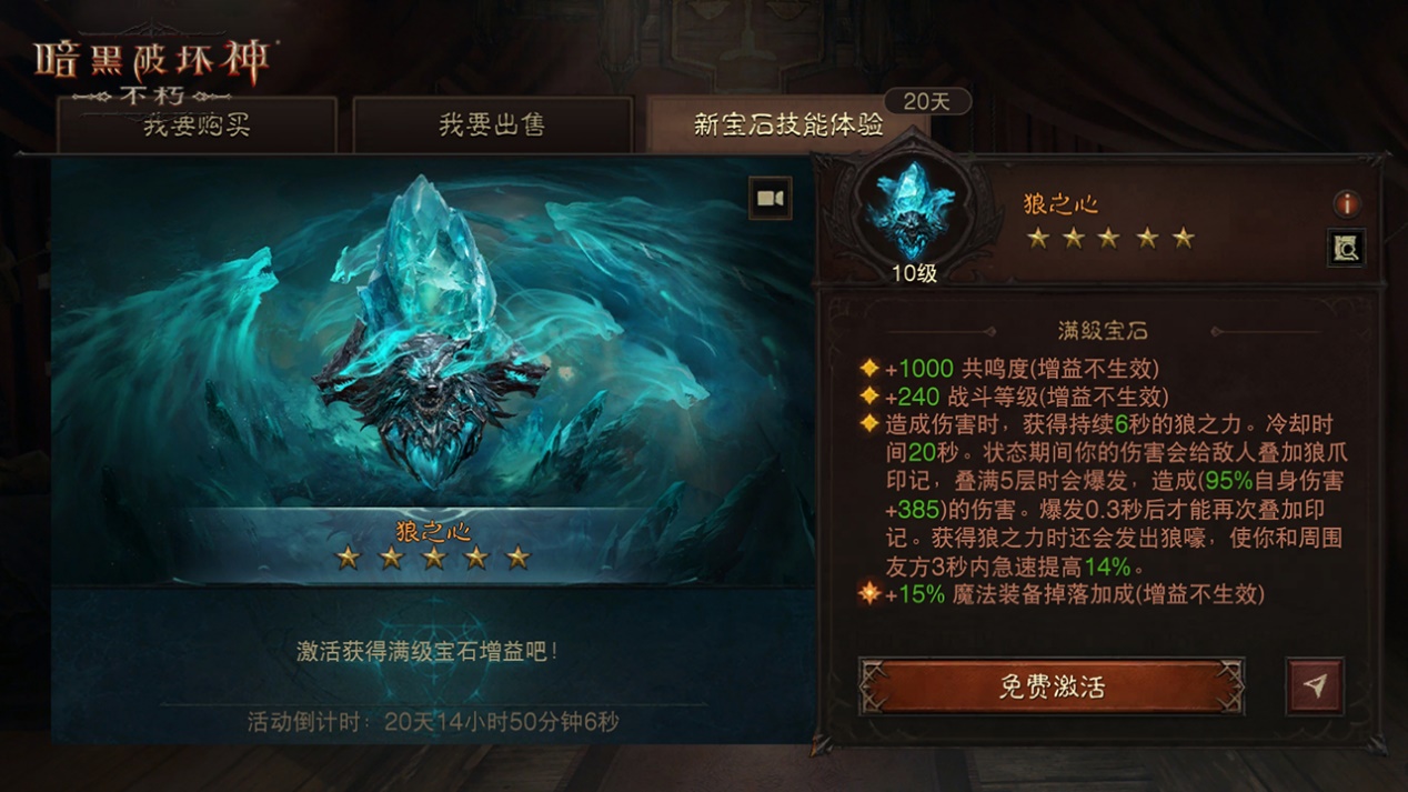 输出爆炸,全民皆可体验?昨日秋季版本“圣剑之光”更新后,《暗黑破坏神:不朽》已开放满级宝石免费体验功能。只要在10月03日2:59前,前往集市的宝石技能体验活动界面,即可获取10级五星传奇宝石【狼之心】增益效果。领取并成功激活后,玩家可以在野外副本和不朽秘境等指定场景中,持续1小时深度体验全新传奇宝石【狼之心】的炸裂输出,体会到最极致的快乐!