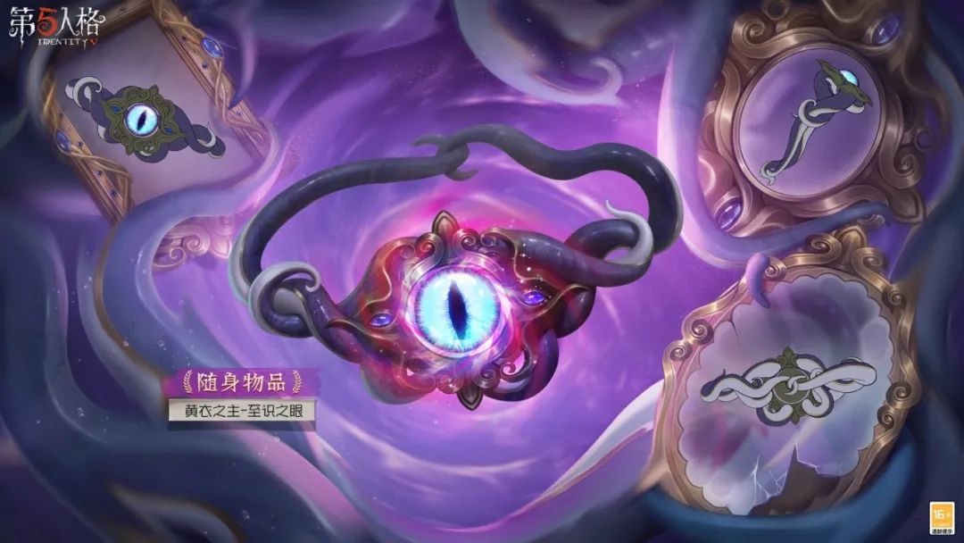 黄衣之主-至识之眼由深紫色和白色交缠的触须组成,正中间镶嵌着一个圆形的珠宝,状似一只竖瞳眼睛,其周身散发着红色的光,仿佛在诉说一些不可名状的故事。