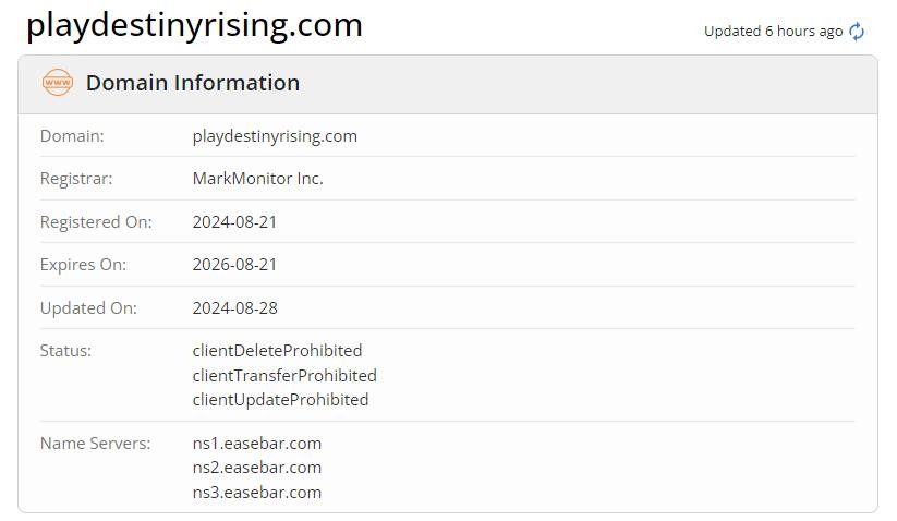 根据The Game Post的报道称,传闻中由网易和Bungie合作开发的手游《命运:崛起》(Destiny Rising)在内部代号为“Viper”,8月21日其注册了一个名为playdestinyrising.com的域名,该域名由MarkMonitor Inc.代理注册,MarkMonitor Inc.此前还为网易注册过《永劫无间》等其他游戏域名。
