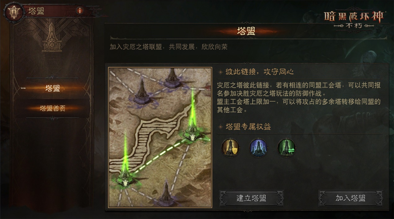 灾厄之塔玩法创新,协力作战建立塔盟。在灾厄之塔耸立的庇护之地上,净化并占领灾厄之塔,一直以来都是无数冒险者工会的追求,在争夺中获胜不仅关乎荣耀与实力,同时也能获得十分诱人的实质性祝福,让玩家能在冒险时实力大增。在《暗黑破坏神:不朽》秋季版本【圣剑之光】中,灾厄之塔发生巨变,塔与塔之间彼此互相链接起来,全新玩法塔盟也由此展开!为了应对突如其来的变故,工会之间纷纷摒弃前嫌联合建立塔盟,围绕灾厄之塔展开激烈争夺。加入塔盟的工会不仅能获得更多专属权益,帮助自己在争夺中取得优势,同时还能获得同一塔盟工会的支援和帮助,真正形成统一战线,共同创建一份不朽基业!