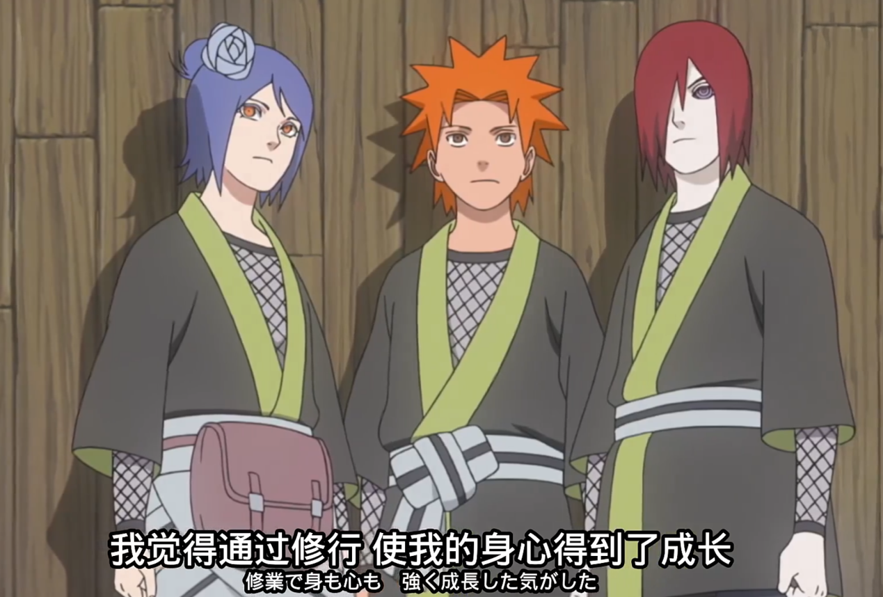 回去之后,长门、弥彦、小南为了使自己变强,能改变这个长期战乱不断的国家,决定跟之前和山椒鱼半藏交战的三位木叶忍者学习忍术。