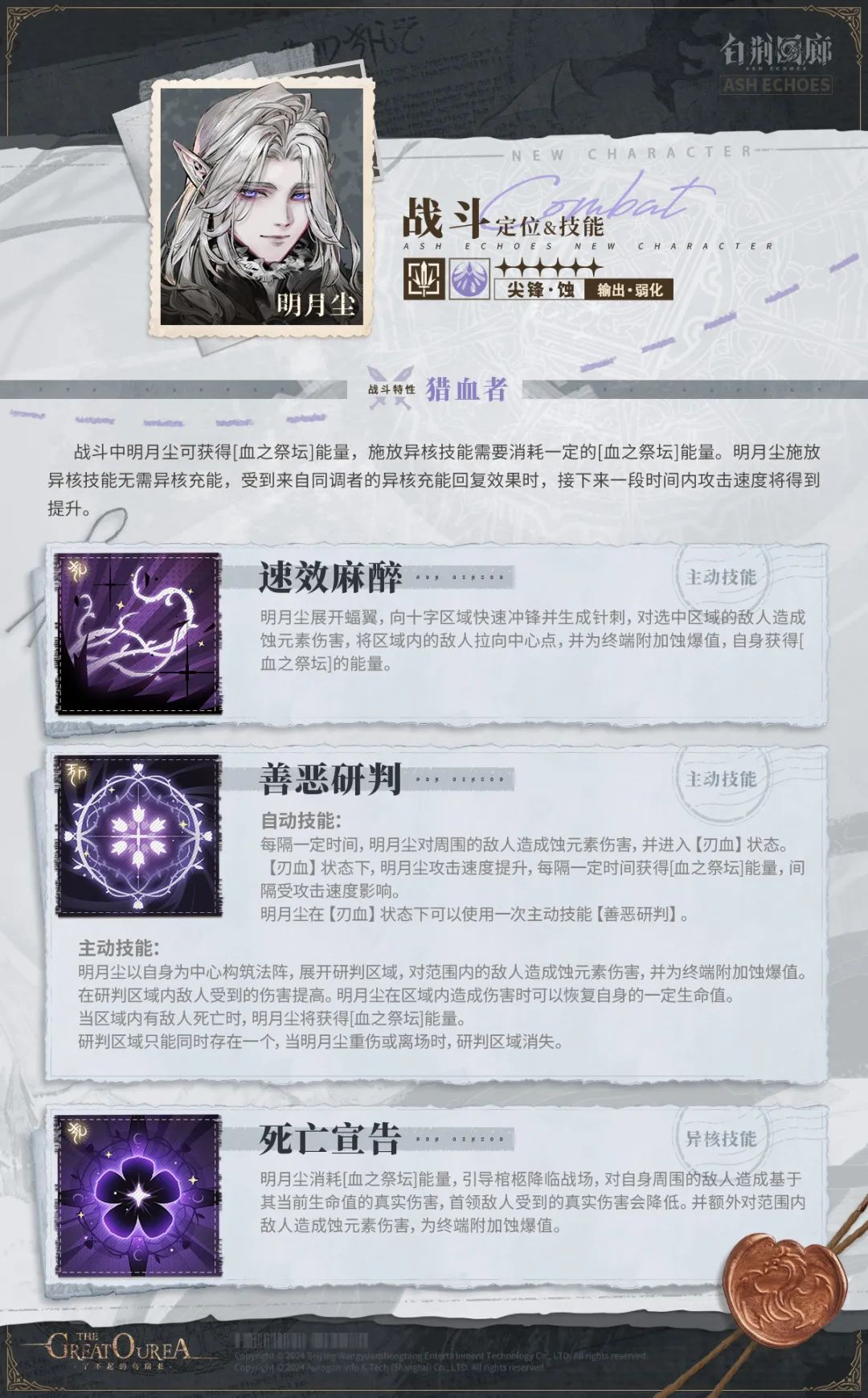 全新六星同调者明月尘于9月19日正式加入定向共鸣池。明月尘是一位蚀系尖锋,作为阿玛辛贵族的他却并不排斥阳光。当有不速之客前来打扰时,他会发起快速冲锋,造成伤害的同时,控制并聚拢路径上的目标。面对周围有较多敌人时,明月尘会施展法阵,在自身周围生成针刺,穿刺范围内的目标,并使目标受到的伤害提高。
