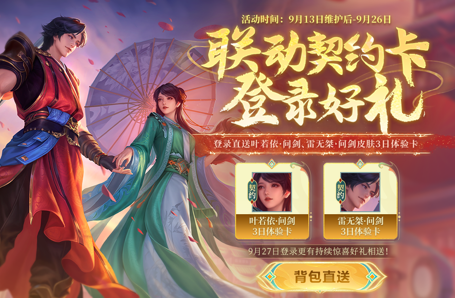 即日起-9月26日,登录游戏即可领取【叶若依-问剑】和【雷无桀-问剑】皮肤体验卡,免费体验联动皮肤。9月27日登录更有持续惊喜好礼相送!参与仙山探宝活动,完成任务可获得藏宝图碎片,免费兑换【叶若依-问鼎】皮肤!