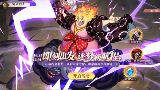 《航海王启航》今年的双十一航海盛典终于来了!这不仅仅是一场购物狂欢,更是你与航海王的冒险再度启航的时刻!从和之国·大妈的震撼登场,到双十一主题活动的重磅来袭,每一位船长都能在这场海上盛宴中收获超乎想象的奖励!特惠礼包、钻石奖池、限时团购,还有首充奖励等你来拿!