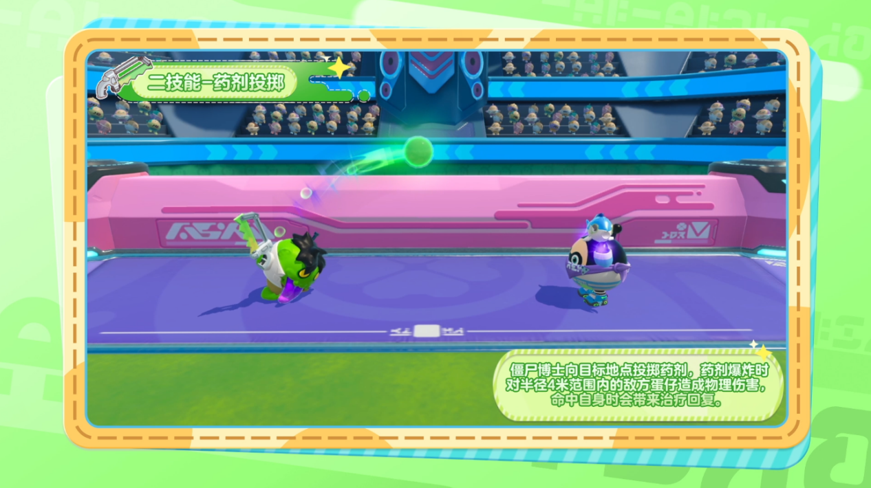 施展二技能“药剂投掷”时,僵尸博士向目标地点投掷药剂,药剂爆炸时对半径4米范围内的敌方蛋仔造成物理伤害,命中自身时会带来治疗回复。
