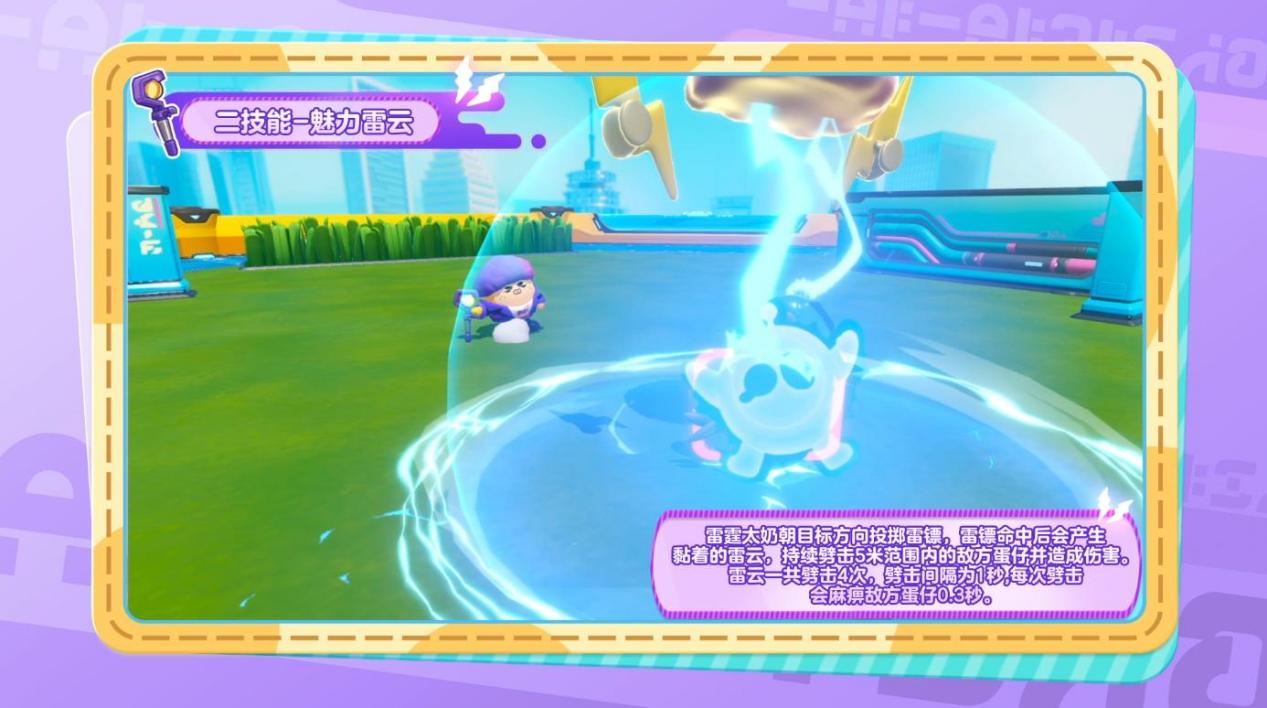 施展二技能“魅力雷云”时,雷霆太奶朝目标方向投掷雷镖,雷镖命中后会产生黏着的雷云,持续劈击5米范围内的敌方蛋仔并造成伤害。雷云一共劈击2次,劈击间隔为1秒,每次劈击会麻痹敌方蛋仔0.3秒。