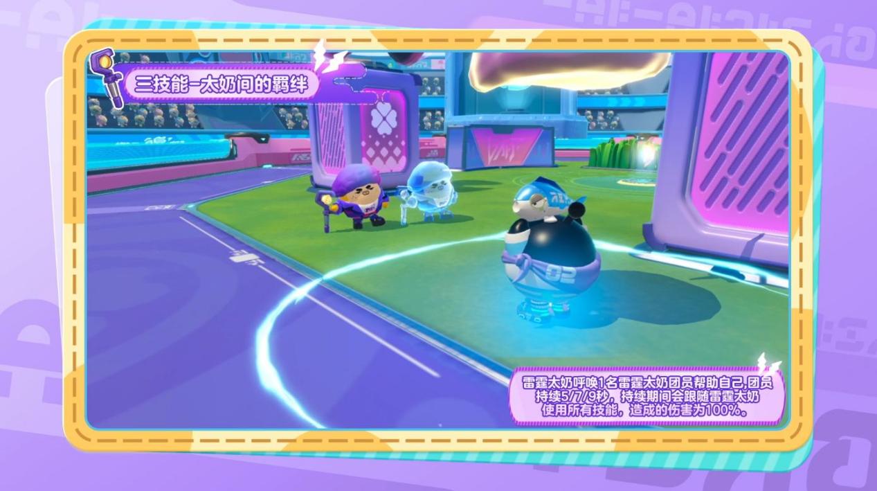 施展三技能“太奶间的羁绊”时,雷霆太奶呼唤1名闺蜜帮助自己,持续5/7/9秒,持续期间会跟随雷霆太奶使用所有技能,造成的伤害为100%。