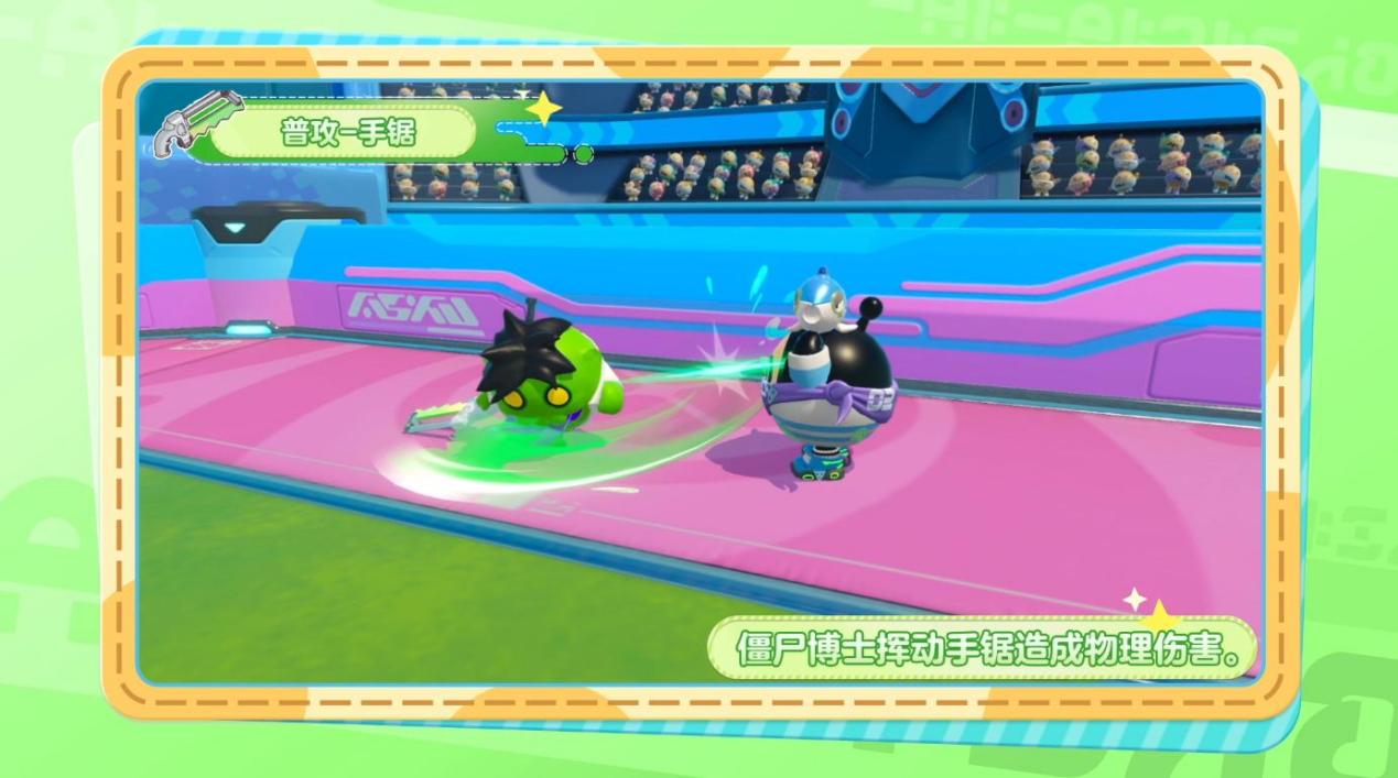 施展普攻“手锯”时,僵尸博士挥动手锯造成物理伤害。