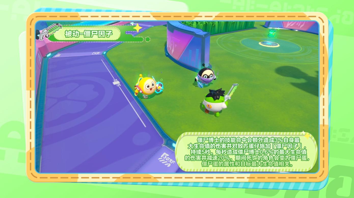 被动技能“僵尸因子”:僵尸博士的技能命中会额外造成3%自身最大生命值的伤害并对敌方蛋仔施加「僵尸因子」,持续5秒。每秒造成僵尸博士0.6%的最大生命值的伤害并减速20%,期间死亡的角色会变为僵尸蛋,僵尸蛋的属性和目标最大生命值相关。