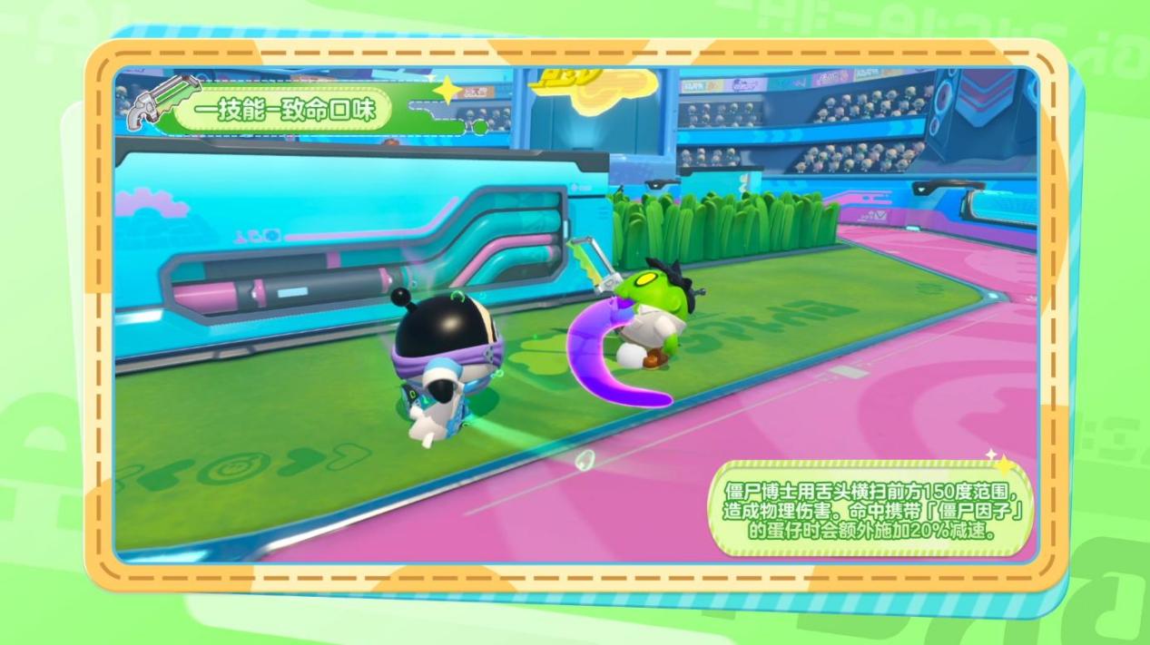 施展一技能“致命口味”时,僵尸博士用舌头横扫前方150度范围,造成物理伤害。命中携带「僵尸因子」的蛋仔时会额外施加20%减速。