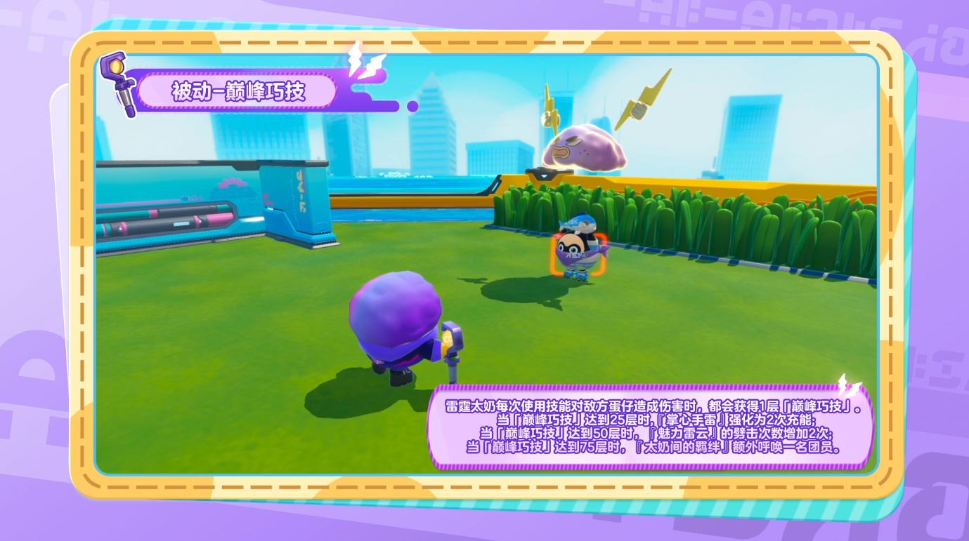 被动技能“巅峰巧技”:当雷霆太奶每次使用技能对敌方蛋仔造成伤害时, 会获得1层“巅峰巧技”。当“巅峰巧技”达到25层时,“掌心手雷”强化为2次充能;当“巅峰巧技”达到50层时,“魅力雷云”的劈击次数增加2次;当“巅峰巧技”达到75层时,"太奶间的羁绊”额外呼唤一名团员。
