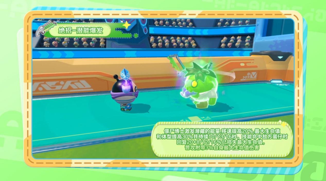 施展三技能“潜能爆发”时,僵尸博士激发潜藏的能量,移速提高20%,最大生命值和体型提高30%并持续10/13/16秒。技能命中敌方蛋仔时回复20+8/12/16%已损失最大生命值,普攻附带3%自身最大生命值伤害。