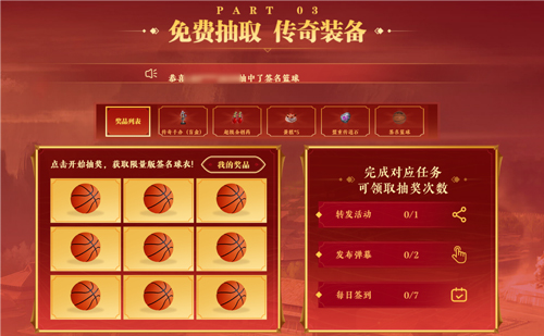 完成转发分享、发布弹幕、每日签到任务获取抽奖次数,即可在页面进行抽奖,还有机会赢得由麦迪亲笔签名的珍贵篮球、球衣和T恤等独家奖励!