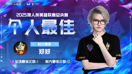 其中来自初次拥抱的选手郑郑首日出战,就凭借着倒钩狼的身份抗推平民出局,最终成功带领狼人阵营拿下胜利并获得全场最佳,而他也成功获得了本次总决赛的个人最佳选手。