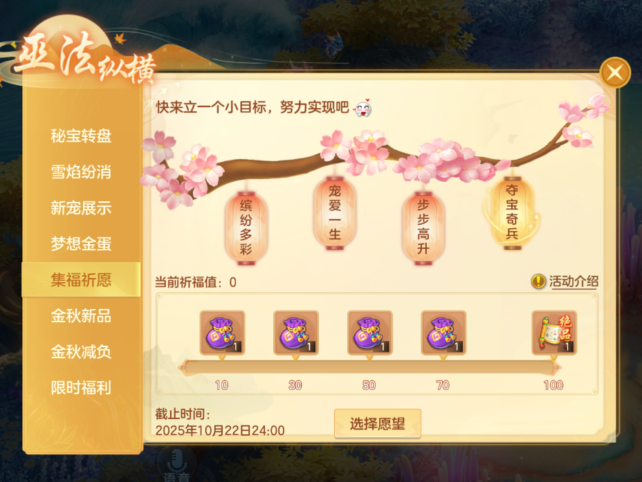 1、集福祈愿:10月9日维护后至10月22日24:00,登录完成任务获得祈愿值翻牌领取奖励。