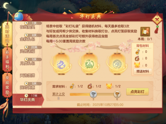 4、华灯庆典:10月9日维护后至10月27日5:00,收集场景道具点亮华灯获得多种奖励。