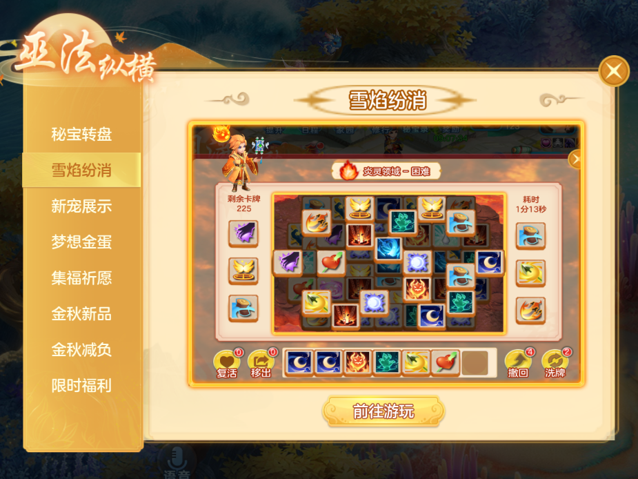 5、雪焰纷消:10月9日维护后至11月5日24:00,完成三消小游戏获取精品奖励,还可通过排行榜获得专属称谓奖励。