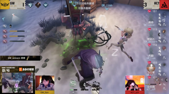 第二天,ACT vs GW第一局上半场,GW_tzym“跛脚羊”追击小船的ACT_Gougou教授,ACT_Gougou八字走位灵活穿梭笼中,目光锁定抬刀精准交出鳞片,GW_tzym在第二个迷失之笼成功拿刀,ACT_Gougou用飞轮折掉第三个迷失之笼,第四个笼子监管者交出闪现才将其击倒,ACT求生者稳定牵制和救人奠定平局基本面。