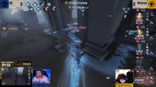 第四天,成都Wolves vs 成都GG第一局下半场,GG_ppxia气象学家,GG_18木偶师,GG_ppz咒术师三人开门战,Wolves_ChoAi击倒咒术师后,气象学家点小门,木偶师在中场卡耳鸣,挂上咒术师后,Wolves_ChoAi传送至小门,此时小门板区已经全部被下掉,而且气象学家层云起飞,监管者想要处理掉气象学家需要花费一定时间,Wolves_ChoAi选择回溯至椅子面前,回防木偶师救人,GG_18预判监管回溯,保证了自己能从小门逃脱的极限身位,最终双方战平。