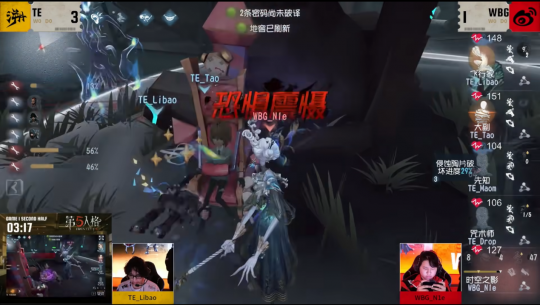 北京WBG vs TE第一局下半场,开局WBG_N1e时空之影追击TE_Tao大副,逼出一个海神怀表,伊斯人在外围寄生并干扰所有求生者破译,WBG_N1e企图蓄力刀过板但新人TE_Tao反应极快,回身进行砸板,而后转入大船再交出第二块海神怀表,逼迫监管者闪现开刀,但因海神怀表加速身位拉得较开且先知及时役鸟支援使其能翻窗继续牵制。在一溜中,TE_Tao逼出了监管者三次寄生,密码机也已经破译完毕三台。虽然局势对监管者不利,但WBG_N1e也稳住心态,在血线即将过半的时候找准时机出刀,恐惧震慑飞行家,找到了自己的翻盘点,在开门战也完成了赏心悦目的控场,顺利完成了四抓。虽然在TE战队救人阶段出现了问题导致了被翻盘,但不失为一场精彩的对局,让我们看到了操作稳定的金光新人,相信假以时日多加训练磨合,TE战队也会未来可期。