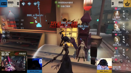 第五天,MRC vs DOU5第一局上半场,MRC_BaiLu时空之影挂上古董商后,在狂欢之椅周围寄生大副生成陶片,利用侵蚀领域和异族本相将侵蚀度叠加到93%,成功打出“砍晕砍“的操作,使其救不下人;而后牵起大副去拦截木偶师,木偶师先交出一次”路易“防范气球刀,靠近椅子后再次成为”路易“准备救援,但在狂欢之椅周围”路易“持续时间较短,在救援过程中变回了本体,MRC_BaiLu瞬发出刀,成功打出恐惧震慑,使求生者整体状态急转直下再无还手之力,最终被四抓。