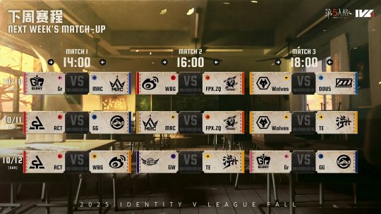 赛季伊始,仅仅五天就让我们对接下来秋季赛百花齐放的表现更加期待,有的队伍还处于磨合成长阶段,有的队伍已经展现出摩拳擦掌跃跃欲试的锐利姿态。在下周的比赛中,榜一榜二Gr战队和MRC战队拉开比赛帷幕,狭路相逢究竟谁能更胜一筹?两支队伍间能擦出怎样激烈的火花?敬请期待10月10日14:00第五人格赛事直播间,我们不见不散!
