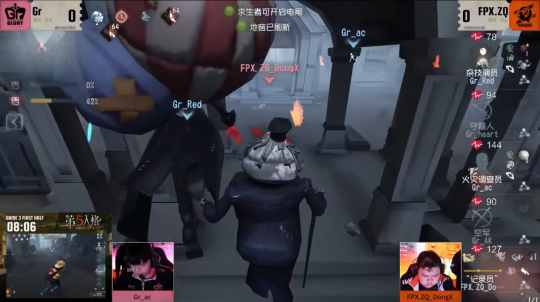 Gr vs FPX.ZQ第三局上半场,FPX.ZQ_DongX“记录员”开局追击Gr_AK空军,并同时管控中场Gr_ac火灾调查员的密码机,Gr_AK在大房靠近小木屋板区的可博弈点选择直接吃刀,将信号枪省下,继而转点至墓地,FPX.ZQ_DongX捏住审阅藏红光进行反绕,成功拉进距离,蓄力刀骗出飞轮,在板间背身再次藏住红光过板将空军击倒。监管者辅助特质仍留在手上,就是对空军开枪的压制,闪现不交求生者方默认监管者携带兴奋,为了能交出信号枪就需要有人来陪跑抗刀,这样就会消耗大量的人力资源,从而拖慢密码机进度。Gr_heart守墓人前来一救,救下人后迅速遁地想为空军抗刀方便交出信号枪,但FPX.ZQ_DongX巧妙利用侧刀精准命中空军,使这杆枪只能留下。待空军被Gr_ac火灾调查员救下后,利用气囊弹射拉开身位,FPX.ZQ_DongX果断交出闪现将空军击倒。此时场上已经减员且还有两台进度不到半的密码机未破译,对于“记录员”来说是优势局。接下来FPX.ZQ_DongX选择消耗守墓人道具,同时观察外围密码机摇晃情况,待守墓人出土后,利用封窗记录封锁交互点,快速击倒半状态守墓人并且快速锁住红毯电机,成功续上第二波节奏。FPX.ZQ_DongX将守墓人挂到地下室,外围两台密码机都在摇晃,监管者先追击红毯杂技演员压迫走位,然后回防火灾调查员前来救援,同时记录杂技演员修机。火灾调查员将守墓人救下后,FPX.ZQ_DongX利用落地刀击倒火灾调查员,并选择换挂。密码机压好,求生者方换位救人,FPX.ZQ_DongX则直接压出去追击守墓人,Gr_heart需要坚持到队友将人救下后再赶往密码机,双方进行竞速,FPX.ZQ_DongX见火灾调查员迟迟未被救下,知道求生者来不及点亮密码机,自己在开门战还有管控大门的能力,选择先下手为强,直接闪现将守墓人击倒淘汰。杂技演员折返后直接将密码机点亮,FPX.ZQ_DongX也直接选择追击杂技,记录小门,Gr_Red被反绕亏身距,想要跳球过窗但失误,只得飞轮进入短板被迫博弈,最终被蓄力刀击倒。FPX.ZQ_DongX抬手记录到小门火灾调查员,因身上有记录能被监管者时时透视位置,Gr_ac将计就计向小木屋方向走位给监管者一个假视野,待身上记录消失后反方向从墓地绕至红毯救人,监管者被假视野迷惑,预判求生者往花园方向走并进行排查,给了火灾调查员救人的可乘之机。FPX.ZQ_DongX使用移形追击没有道具的火灾调查员,但两板一窗区利于牵制且“记录员”手上并没有多余的封窗记录,并未能在挽留结束前将其击倒,但介于“记录员”极强的控场能力,虽然在击倒火灾调查员的过程中花费了一些时间,杂技演员也未能成功将大门点开。FPX.ZQ_DongX因比分落后不得不争四抓,继续追击杂技演员,Gr_Red转点至四号机附近,火灾调查员交出绝处逢生后去点小门,FPX.ZQ_DongX欲蓄力刀过板,Gr_Red成功博弈砸板为队友拖时间,杂技演员利用爆弹和飞轮进行进一步牵制,并逼出监管者的移形,虽然在此过程中记录锁住了大门进度,但杂技演员的稳定牵制使“记录员”的记录青黄不接,“记录员”只能一边步行压过去一边等记录,在收审阅的同时,火灾调查员将小门成功点开,杂技演员交出绝处逢生地窖逃生,完成了一场不可思议的开门战平局!