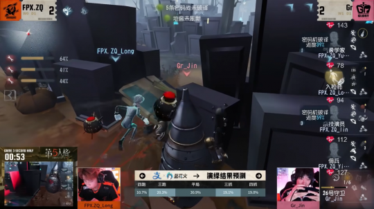 精彩依然延续到第三局下半场,Gr_Jin 邦邦追击红毯FPX.ZQ_Long入殓师,入殓师直接进行拉点至大房,Gr_Jin熟练使用炸弹在大房通往墓地的窗户架点,使入殓师若想转出去就必须吃炸弹伤害;双方进入墓地后,Gr_Jin投掷5s炸弹埋伏笔,不断捏放炸弹试探入殓师走位方向,最终在入殓师下板的时候利用前面的炸弹引爆二连雷对其造成伤害。Gr_Jin从外侧压住入殓师身位,在板区交炸弹,将入殓师架点在狭窄过道内,而后贴近身位放置遥控炸弹,又放置一颗普通炸弹骗出入殓师飞轮,再引爆遥控炸弹将其击倒,击倒全程不到一分钟,一刀未出,将求生者的心理完全拿捏。Gr_Jin将其挂回灵柩所在的红毯椅子,并在狂欢之椅上放置一颗炸弹,逼迫其返生,并在红毯窗户放置5秒炸弹封锁转点,入殓师倒到角落,佣兵修机后距离较远且26号守卫救人压力较大,只能将其卖掉。Gr_Jin而后移形追击FPX.ZQ_Yuan的气象学家,远程抛炸弹隔着障碍物出其不意对其造成伤害,气象学家利用层云进行拉点,虽然用飞轮抵消了一次炸弹伤害,Gr_Jin眼疾手快补上遥控炸弹在其翻窗后落点引爆,气象学家再次利用层云转点,但高度不够还是被击落下来,监管者盲视野连雷将其击倒,又是一次全程未出刀的追击表演。Gr_Jin在椅子上放置三颗炸弹逼迫佣兵快速来救人,之后去追击正在修机FPX.ZQ_lin的杂技演员,想把其留在墓地遗产机,FPX.ZQ_lin尽力突出重围,但Gr_Jin熟练度实在是高,一刀一炸,移形跟上,预判杂技演员跳球落点,自信背身引爆,将其击倒,挂回遗产。气象学家只得在外围重新开启密码机,佣兵匍匐在侧准备压满救,但爆炸专座催发了淘汰进度,开门战因移形cd未好,只能淘汰一边,最终收获三抓拿下比赛!整个对局全程是一场酣畅淋漓的架点艺术,全局Gr_Jin只出了三刀,剩下全靠炸弹完成,足以可见其恐怖的熟练度。