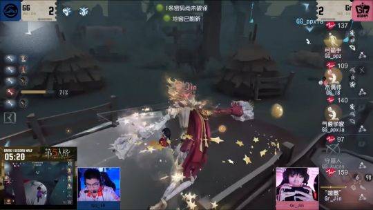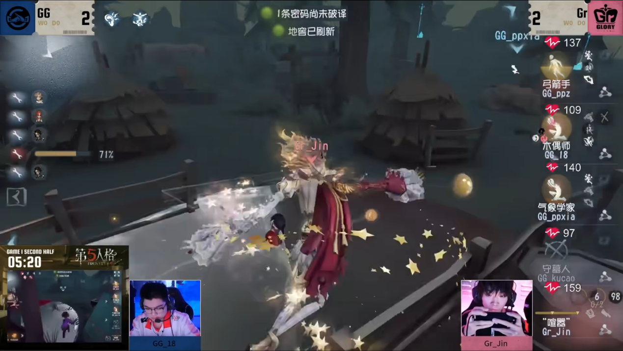 第三天,Gr vs成都GG第一局下半场,Gr_Jin“喧嚣”在湖景村大船船头将守墓人淘汰后,移形去追击GG_ppz弓箭手,GG_ppz利用臂弩命中监管者后再使用飞轮规避双重惊喜的两层标记,顺利进入板区,“喧嚣”空中飞人跟上距离,火速施加粘土标记,在弓箭手转入小木屋前成功拿到一刀伤害,而后再次使用双重惊喜将其击倒上挂,而后直接赶往中场守遗产机。GG_18木偶师也在此期间成功将海边密码机补开,待监管者离开后将弓箭手救下。Gr_Jin利用空中飞人快速贴近中场,远程操控分身成功对GG_ppxia气象学家附上两层惊吓标记,通过对舞台的精准把控在板间快速将其击倒,接着去将木偶师逼离中场,仅用10秒便使其状态仅剩四分之一,然后使用移形回防气象学家和弓箭手调整状态,仅用4秒再次将气象学家击倒,利用移形返程,远程释放分身精准定位木偶师,自信回头出刀附上干冰标记,与之前还没消散的惊喜标记叠加触发伤害将木偶师击倒并上挂,最后收割弓箭手,顺利拿下四抓。Gr_Jin从开局击杀守墓人,到两次守椅均成功追到双倒,再到围绕最后一台密码机的拉扯,每次出击都在电光火石间爆发,打对手一个措手不及,风格强悍得让人望而生畏。