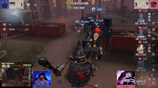 同样还是两支队伍对决的第三局下半场,地图选在月亮河公园,开局MRC_HuaC幸运儿利用忘忧之香牵制26号守卫,在活木马地窖点双窗区,Gr_Jin5秒炸弹横向拦截,接2秒炸弹将幸运儿身位向河边一侧压,26号守卫本体在外侧向地图边缘内压,同时用2秒炸弹将其退路封住,MRC_HuaC在狭窄地形灵活走位规避掉每一次炸弹伤害,利用擦刀间隙拉出更远距离,将监管者移形逼出,辅以MRC_XiaoX前锋的帮助,把牵制时间尽可能拉长。在救人阶段,MRC_XiaoX在监管者面前施加压力,骗出其炸弹,MRC_XiaoD机械师在后方迂回将人救下,MRC求生者的战略部署非常具有前瞻性,机械傀儡多次治疗前锋,为己方争取到更多的修机时间。但因前期前锋辅助亏损较多的密码机进度,整体密码机进度还是不容乐观,MRC_XiaoX前锋进行撞救将监管者的底牌逼出,再飞轮躲掉炸弹,无伤将幸运儿救下,使其成功翻板并加以补撞,增加幸运儿牵制空间。幸运儿被淘汰后,前锋牵制到密码机压好,但还是被压到起身,MRC_Nanako小说家抗住压力极限博弈眼疾手快将人救下。因前期求生者队内沟通及时,在幸运儿第一次上挂的时候,MRC_XiaoD机械师及时调动在狮笼地窖点的机械傀儡,避免被炸弹击倒,在整个对局,MRC_XiaoD物尽其用,机械傀儡自己独立破译一台密码机,在前锋拉远后来到人皇桥补遗产机,开门战又瞒天过海赶往起点站,躲掉炸弹将大门点到80%后功成身退,最终小说家和前锋双人利用化险为夷强行将大门点开,完成了一场让人意想不到的三人三跑!
