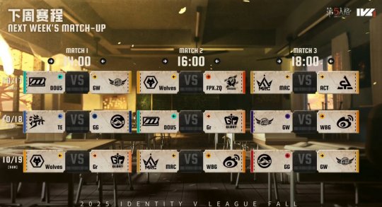经过前两周的磨合和对比赛新版本的适应,各个战队都逐渐打出风采,亮出自己的锋芒,下周GW战队迎战排名较前的强敌DOU5战队,能否继续保持本周的火热手感?旗鼓相当的对手相遇,谁能兵行奇招、先发制人?敬请期待10月17日14:00第五人格赛事直播间,我们不见不散!