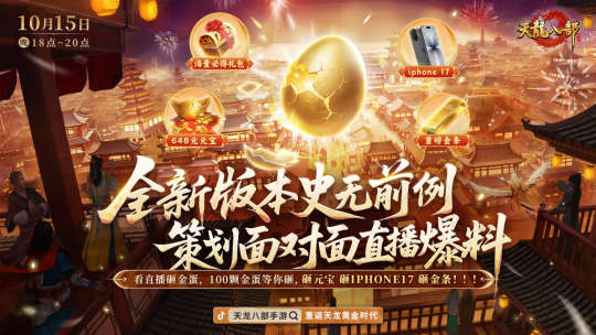 想要知道新版本的猛料?10月15日18:00-20:00,请锁定天龙八部手游抖音官方直播间。策划大大将来到直播间,带大家抢先领略新的江湖。