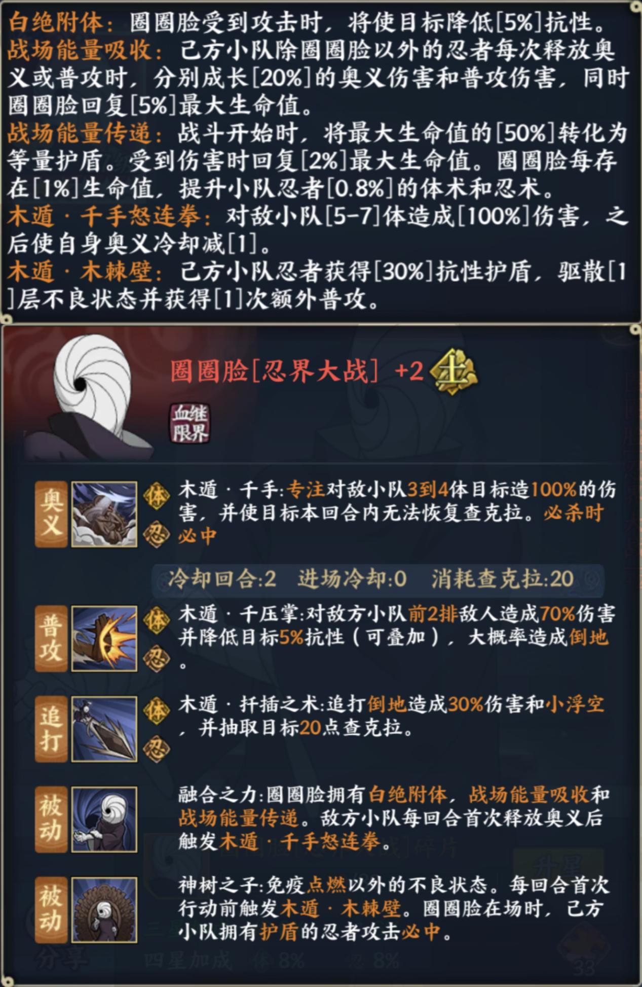 被动Ⅰ:融合之力:圈圈脸拥有白绝附体,战场能量吸收和战场能量传递。敌方小队每回合首次释放奥义后触发木遁·千手怒连拳。