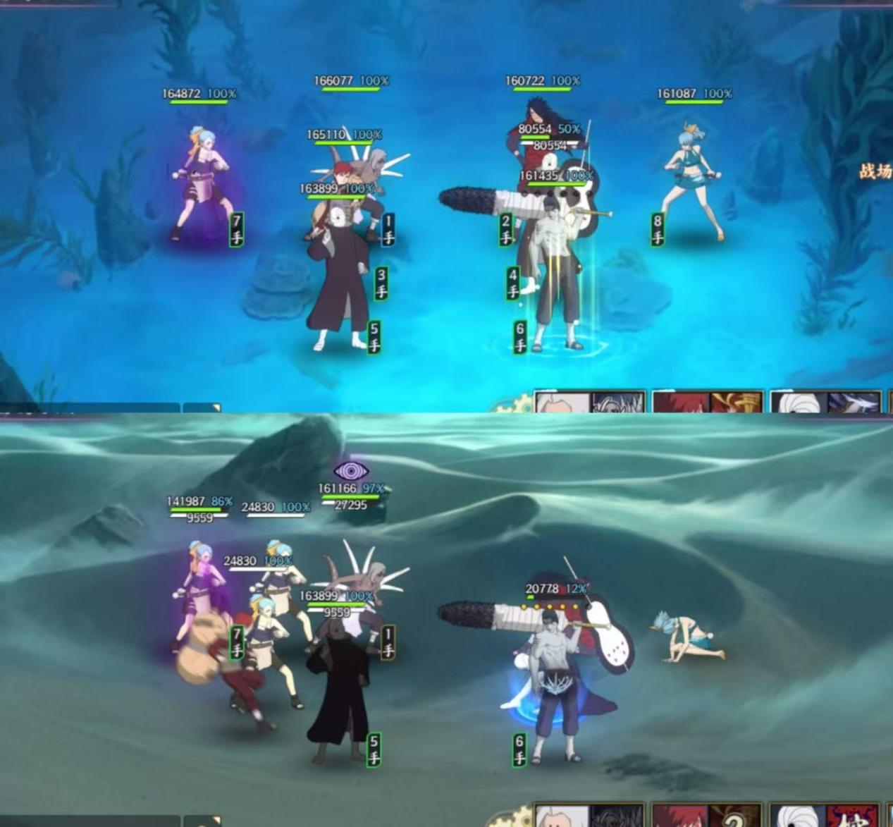 7、对方斑奥义,但对方鬼鲛触发了结界,破除了我方君麻吕的结界,我方君麻吕的被动伤害打断了对方斑;