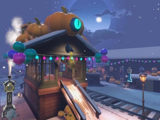 惊魂夜节日氛围地图上线!诡谲幽暗的惊魂火车站地图内,各处惊现闪着诡异瞳光的南瓜,马车上装扮彩带和节日横幅,千万别被吓懵咯!