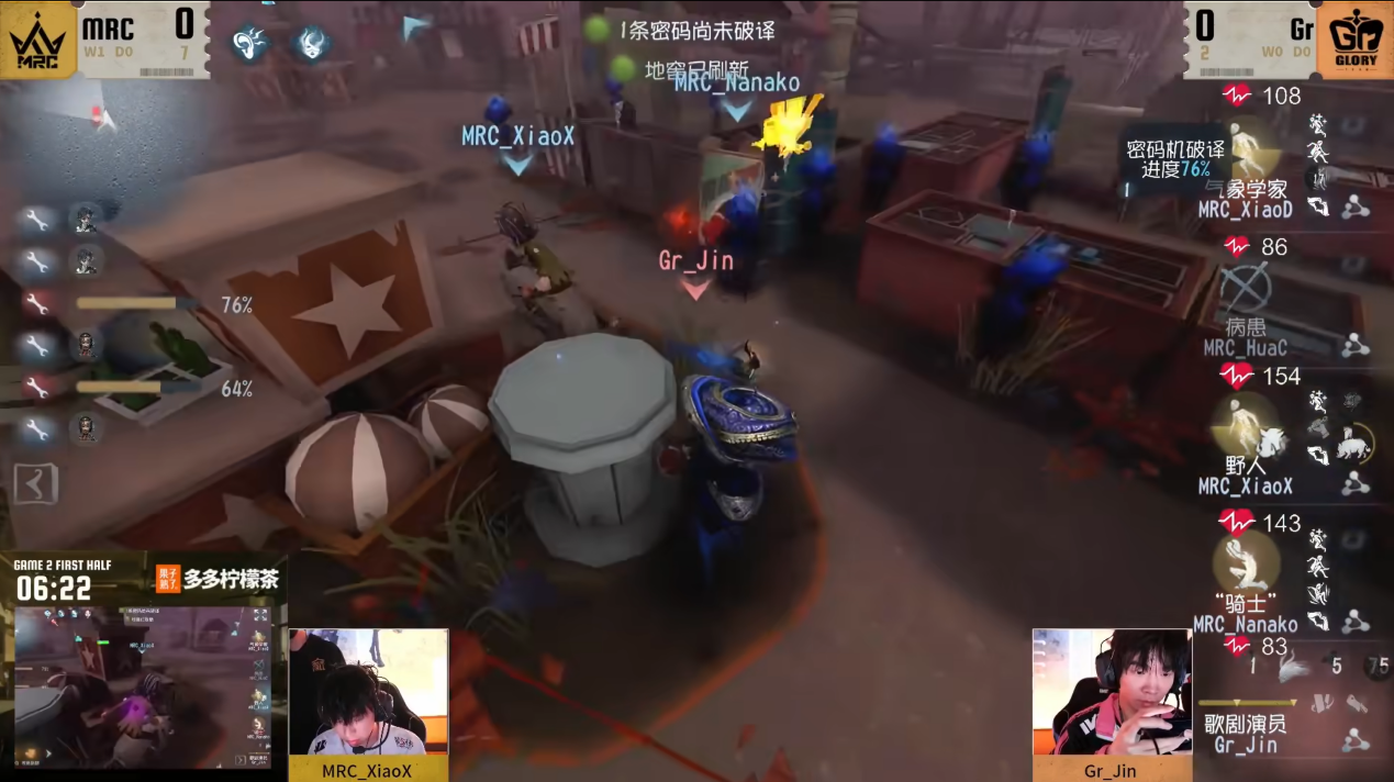 第三天MRC vs Gr第二局上半场,Gr_Jin歌剧演员开局直奔月亮河公园马戏团向MRC_HuaC病患发起挑战,MRC_HuaC在两板一窗区下板形成封闭长窗,Gr_Jin从外侧向内压制病患使用钩爪的身位,在站台连接处板区果断断掉影跃利用加速跃至板前成功抽刀,MRC_HuaC使用钩爪上站台进行迂回,但最终还是在Gr_Jin高超的追击技术下不足一分钟败下阵来。因前期使用过失常,在淘汰一人后场上密码机还剩下两整台未被破译,Gr_Jin底牌切传送找MRC_XiaoD第二波节奏,MRC_XiaoD利用强风先拉开身位然后使用层云拉进和起点站的距离,吃刀后坐上过山车,尽可能拖长自己的牵制时间,最终在死木马前板区被击倒。MRC_Nanako“骑士”前来救援,因其荣誉守护特质,气象学家能继续坐过山车进行牵制,监管者也果断换追“骑士”并压住遗产机。气象学家已被解放,在外围直接新开密码机,挂上“骑士”后,Gr_Jin传送至马戏团浅浅压迫MRC_XiaoD,而后再回溯至椅子前面进行守椅,MRC_XiaoX野人将“骑士”救下后,立马骑乘野猪进行ob,利用箱子和树形成的独立建筑物与歌剧演员周旋,因为周边没有影域可以使歌剧演员影跃而获得加速,一时间难以处理掉野人,只能被迫拖时间,迫于外面密码机进度的压力以及预判野人骑乘时间即将结束,监管者强行将“骑士”牵起,但MRC_XiaoX利用最后一丝骑乘时间看准牵气球动作的瞬间直接将人撞救下来,配合“骑士”加以盖板,成功将密码机拖至压好,最终双方战平。MRC求生者通过极强的韧性,以及MRC_XiaoX对野人克制歌剧演员方面的理解,人尽其才在本局至关重要的作用,为己方保留优势。