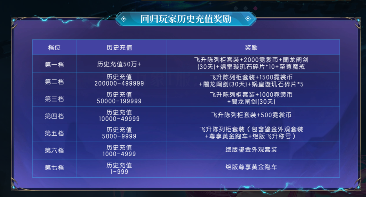 本次新服特别为回归玩家定制专属权益,账号满足“≥30天未登录”条件即可认定为“回归玩家”,可领取回流专属奖励(活跃玩家无法领取)。回归玩家历史充值奖励共设7个档位,根据玩家历史充值金额分级发放,充值额度越高福利越丰厚,涵盖飞升陈列柜套装、霓裳币、娲皇璇玑石碎片、绝版鎏金外观套装、绝版尊享黄金跑车等珍稀道具,帮助回归玩家快速衔接战力,重拾巅峰游戏体验。