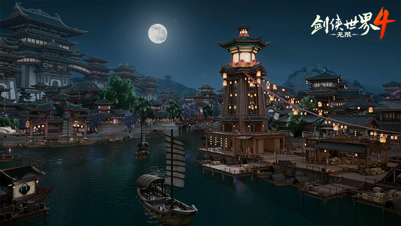 到了傍晚,光线将整个江湖染成橘红色调,连微尘都在空气中清晰可辨,形成道道肉眼可见的光束。入夜后,明月穿行于云层之间,影逐波流,流转不定。这种“有逻辑的光影”,让每个时刻的江湖都拥有独一无二的氛围。