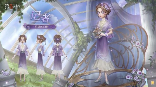 渐变的紫色长裙柔软轻盈,仿佛来自回忆中的某个夏日,蝶翼造型的飘带在背后垂落,她像花房中的精灵,为植物们带来晨光和雨露。小巧的方形鸟笼亦缠绕着藤蔓,但里面并没有鲜活的生命,只有一只枯木雕刻的鸟儿,被她随身抱在怀中。