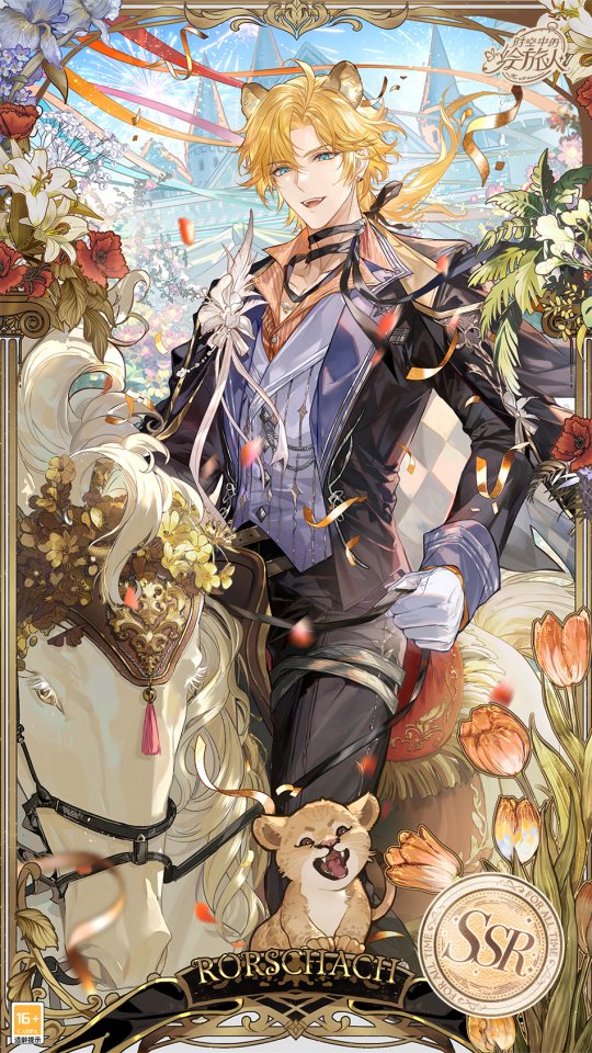 白马额革缀满鲜花,跃动的明黄与他发梢流淌的金芒交织呼应。