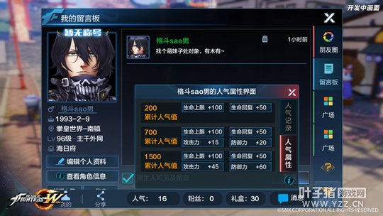 图7-人气属性加成 【开发】导师功能开发 【优化】邮件、聊天提醒功能 【开发】按标签推荐好友功能 【优化】发送状态时查看添加的图片,增加删除按钮 【优化】有人查看我的装备时,弹出的提示消息中玩家名称做成可点击链接 【优化】交互菜单界面显示优化 【优化】好友和私聊信息优化 总的来说,此次游戏修改主要是两个方面: 1、社交现实化:通过此次优化,《拳皇世界》朋友圈不仅支持玩家分享游戏道具、装备、格斗家、机车等游戏中的内容,还支持玩家分享现实生活的点点滴滴,社交功能全面现实化! 2、以玩家为本:在《拳皇世界》中,不管你是喜欢日常刷怪打装备的游戏狂人,是喜欢每天发发动态、秀秀自拍的社交达人,都将获得相应的收益。以玩家为本,有付出就有回报!